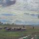 Il piccolo dipinto rappresenta un gregge al pascolo con il proprio pastore immerso in un paesaggio agreste, forse proprio la campagna friulana che Corompai iniziò a frequentare a partire dalla metà del primo decennio del Novecento, dopo il matrimonio con la moglie Felicita, la quale possedeva una casa a Cimpello, vicino a Fiume Veneto. Il pittore avrebbe rappresentato altre volte greggi con i pastori e questo si vede ad esempio in un altro dipinto presente in catalogo intitolato Verso sera a Barcis In particolare il piccolo quadro rimanda all’opera di Giuseppe Mentessi, che Corompai avrebbe, secondo la storiografia, conosciuto all’Accademia di Brera e di cui sarebbe stato addirittura allievo nel 1892. La tecnica utilizzata da Corompai in questo dipinto non è quella consueta dell’olio, ma è il pastello e questo avvicina l’opera ancor più al personale divisionismo di Mentessi. Il colore è steso a lunghi e sottili tratti, sia per quanto riguarda il prato, dove si alternano, stesi puri sul supporto, il verde, il marrone-rosso e il giallo, sia per quanto riguarda le nuvole che occupano gran parte del cielo, compatte ma al tempo stesso leggere. Le due figure umane – il pastore e un passante in bicicletta –appaiono invece come presenze quasi aeree, impalpabili, semplici comparse di una raffigurazione interamente dedicata alla natura.