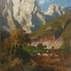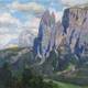 In questo dipinto Corompai ricorre al genere che forse, assieme al ritratto, gli è più congeniale, quello paesaggistico, e immortala nel cartone uno scorcio montano. Ci troviamo in Trentino Alto Adige, dove l’artista si era più volte recato, in particolare a partire dagli anni Venti, anche per assolvere a commissioni di carattere religioso. Ad un’attenta analisi del dipinto, si può intuire quale sia il soggetto rappresentato e il punto di vista da cui Corompai lo ha colto: si tratta di uno dei monti più alti e imponenti delle Dolomiti alto-atesine, il Sassolungo che, assieme al gruppo del Sella rappresentato in secondo piano, sovrasta la Val Gardena e ne segna il confine con l’Alta Badia. Il massiccio pare essere visto dalla Valle di Siusi, un altipiano che si raggiunge dal paese di Castelrotto e che si trova a ridosso, appunto, del Sassolungo. Nel dipinto l’artista utilizza una gamma cromatica che va dal verde al marrone, dal rosa al grigio, attento alle sfumature che così peculiarmente caratterizzano la roccia e la flora alpina, nonché agli effetti chiaroscurali che vengono creati dai profili frastagliati della montagna. Contrasta con essi il cielo percorso da molte e vaporose nubi bianche.