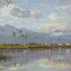 Il dipinto, come esplicita il cartellino apposto sul retro, venne esposto nella sala II, con il numero di catalogo 2, alla Terza mostra d’Arte del Friuli Occidentale, tenutasi a Pordenone dal 13 al 27 settembre 1925. Assieme al quadro in oggetto, Duilio Corompai presentò altre 28 opere, tutte di genere paesaggistico, dedicate soprattutto agli scorci veneziani e lagunari, nonché a quelli friulani. Il fatto che ai dipinti del pittore fosse dedicata una mostra personale che occupava interamente la seconda sala dell’esposizione, è indice della grande considerazione di cui godeva l’artista veneziano in ambiente pordenonese. Della sua pittura la critica locale apprezzava soprattutto la “sincerità” , come si ravvisa nelle parole di Vico Marpillero che recensendo nelle pagine de «La Panarie» (1924) la Seconda mostra d’Arte del Friuli Occidentale, svoltasi a Pordenone dal 15 al 24 settembre 1923, a cui Corompai aveva partecipato con 22 dipinti (quasi tutti di soggetto paesaggistico), così scriveva: “Luminosa, onesta e lieta, ecco la pittura di Duilio Corompai nella cui saletta si respira un’aria di famiglia, che un ritratto di bimbo ed uno di uomo maturo ambientano serenamente. […] Ma Corompai è sincero in tutti i suoi lavori. Anzi io credo che raramente sia dato di osservare una così perfetta corrispondenza tra l’artista e la sua opera, sia che raggiunga uomini e bimbi come in questo Campo S. Barnaba e nella Passeggiata sulle zattere, o la nostra campagna in quadri grandi e piccoli, visioni serene e aperte di pianure, di monti e di fiumi, come in questa Sul Meduna, la quale possiede tutta la grazia e la forza dei migliori paesisti francesi dell’800” Il paesaggio, con un lago in primo piano sulla cui riva si vedono delle case e con le montagne sullo sfondo, è reso con pennellata materica, corposa, soprattutto per quanto riguarda i cirri rosati che si stagliano sul cielo azzurro tenue, e anche i dettagli della vegetazione e delle case, che si riflettono sullo specchio d’acqua, lasciano cogliere la consistenza della pittura stesa a piccoli tocchi.