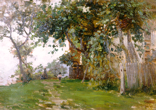 Questa tela raffigura dei rustici casolari, seminascosti dalla presenza delle rigogliose chiome di alcuni alberi. La tecnica è veloce, quasi compendiaria, atta a dimostrare il modus operandi del pittore, che amava raccogliere in “appunti” le impressioni che egli percepiva osservando un particolare scorcio o un soggetto particolare. Successivamente rielaborava la propria idea in studio e da lì uscivano dipinti di grandi e piccoli formati, che comunque non perdevano l’immediatezza del bozzetto originale.
