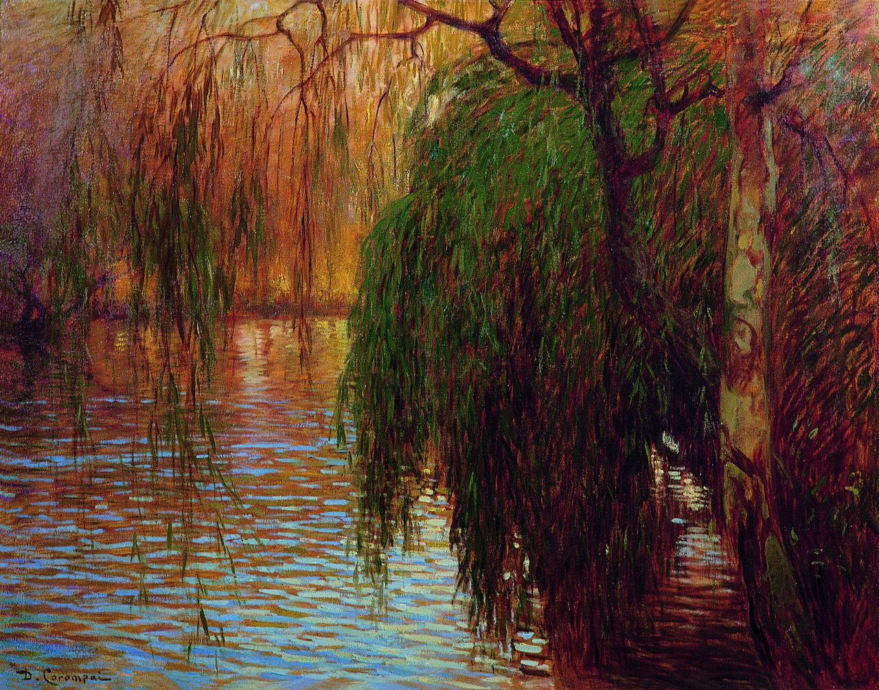 Nel dipinto, in primo piano, è raffigurato un grande salice, le cui fronde sono realizzate tramite l’accostamento di pennellate sottili e dei colori del verde e del marrone. Lo stesso vale per le fronde che si vedono in secondo piano, mentre l’acqua del fiume è resa attraverso sottili tocchi di azzurro, bianco e ocra, colore quest’ultimo che va infittendosi mano a mano che si raggiunge la linea dell’orizzonte, a riflettere gli ultimi raggi dorati del sole al crepuscolo.